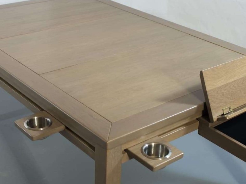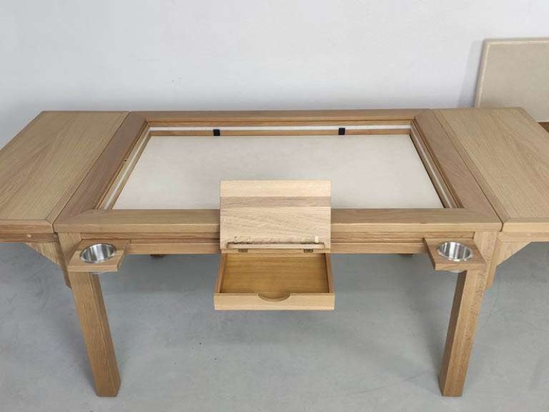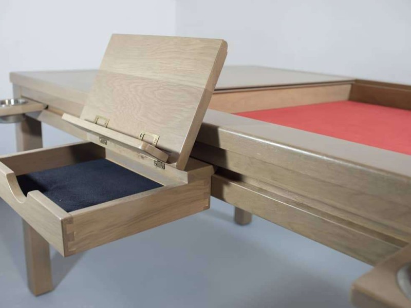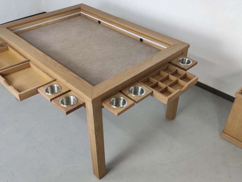 Además, puedes seleccionar de una lista de accesorios periféricos completamente opcionales para jugar con el máximo confort. Todos están fabricados en madera de pino macizo con un acabado en barniz de alta dureza, al igual que nuestras mesas. Tienes muchas opciones como portavasos, bandeja para cartas, caja de fichas, caja de dados, cajón extraíble, bandeja doble, atril, caja compartimentada y portavasos.