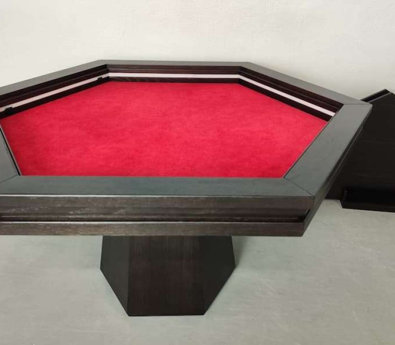 En nuestra mesa hexagonal Andrómeda podrás tener todas las comodidades del resto de nuestras mesas en un nuevo diseño. Mesa hexagonal Andrómeda fabricada en roble, tanto marco como patacón, con certificado ecológico (PEFC). Acabado en barniz de alta dureza. Elección de color. Raíl interior para cartas. Carril exterior para accesorio. Tapa de 2 piezas y listón separador. Elevación de tapas mediante “push”. Fondo acabado en madera con posibilidad de poner fondo con base tapizada reversible. Compatible con la iluminación led.