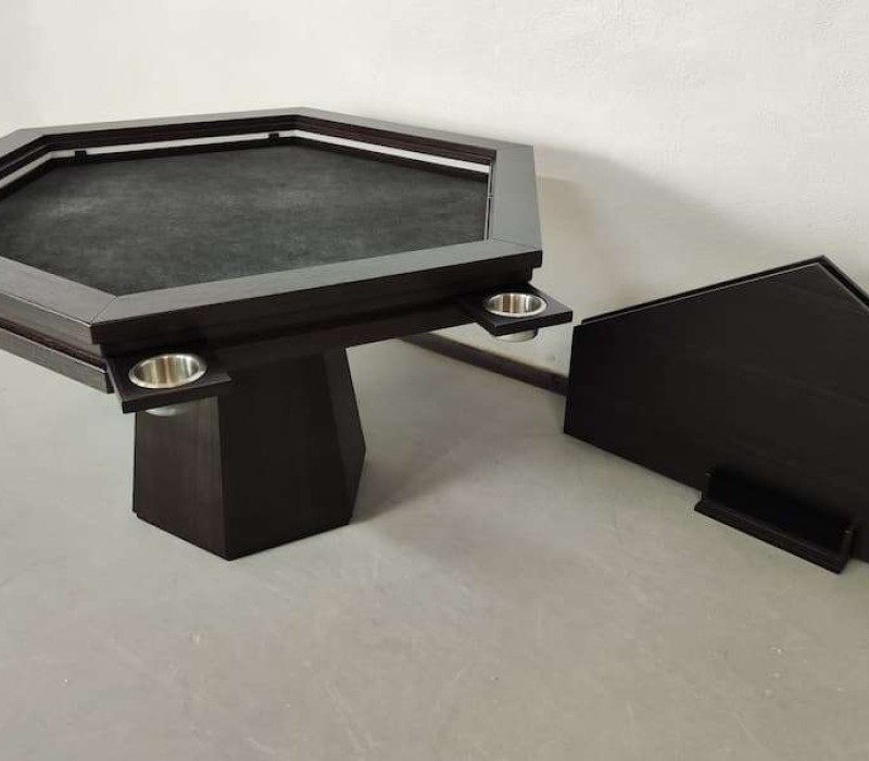 In our Andromeda hexagonal table you can have all the comforts of the rest of our tables in a new design. Andromeda hexagonal table made of oak, both frame and legs, with ecological certificate (PEFC). Finished in high hardness varnish. Choice of color. Inner rail for cards. Outer rail for accessories. 2-piece lid and separating strip. Lid elevation by means of “push”. Wooden finished bottom with possibility of reversible upholstered base. Compatible with LED lighting.