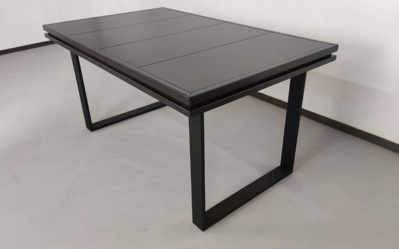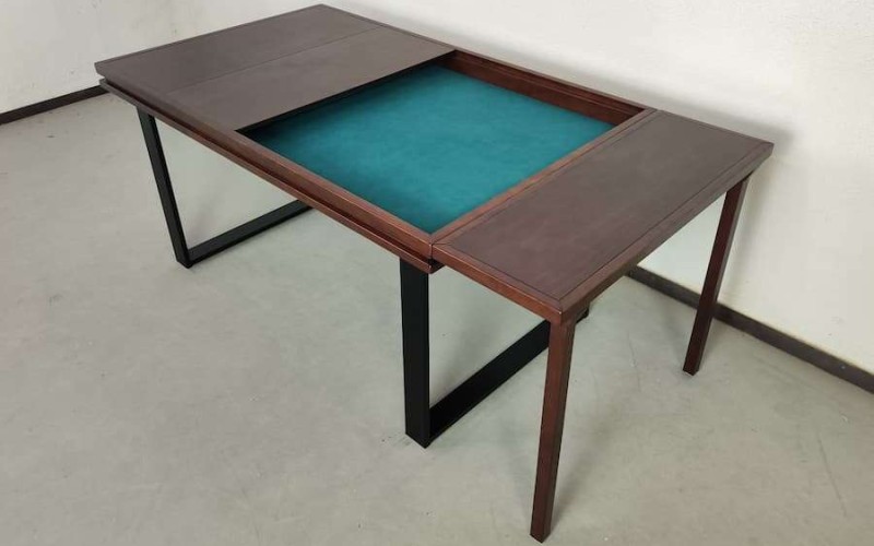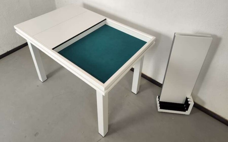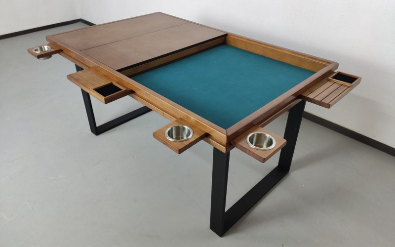 Mesa para juegos Artemis fabricada en pino macizo con certificado ecológico (PEFC). Acabado en barniz de alta dureza. Elección de color. No se puede hacer en medidas especiales. Tapa de 4 piezas. Elevación de tapas mediante sistema “push”. Fondo tapizado fijo. Carril exterior para sujeción de accesorios. Rail interior para colocación de cartas y listón separador de partidas. Compatibilidad con sistema de extensión. NO compatible con cajonera para guardar tapas ni con la iluminación de leds. Patas metálicas con posibilidad de elegir color, negro o blanco.