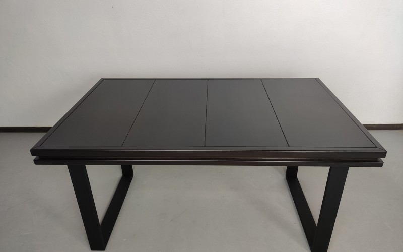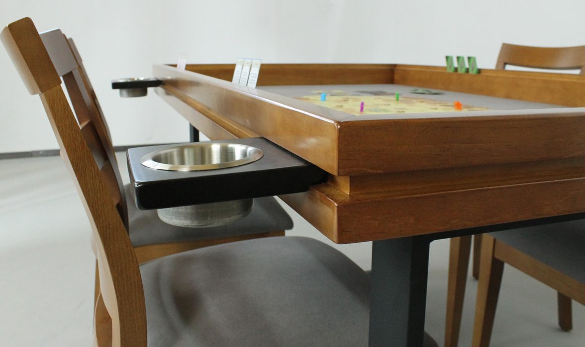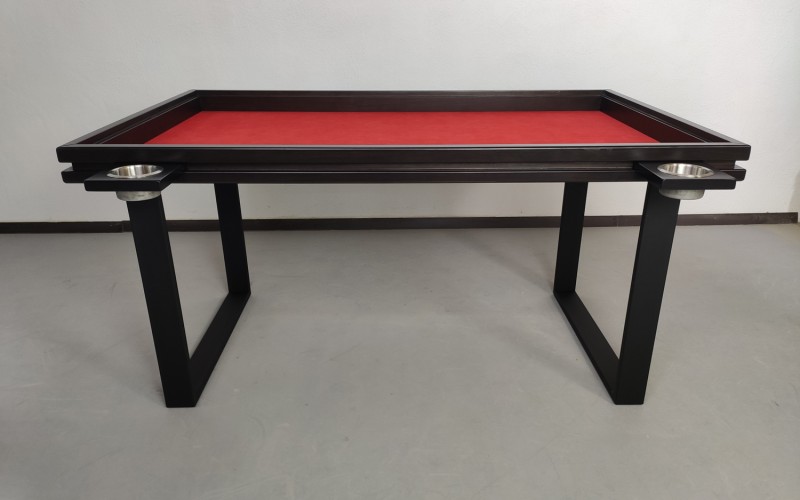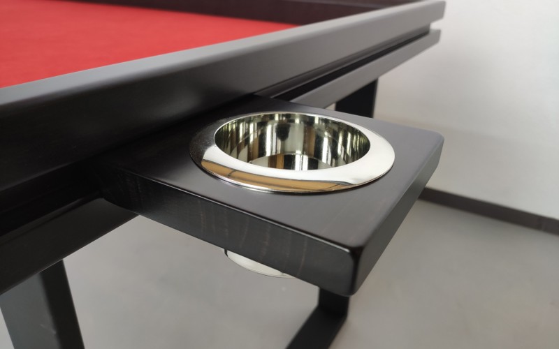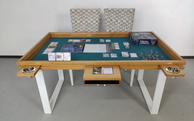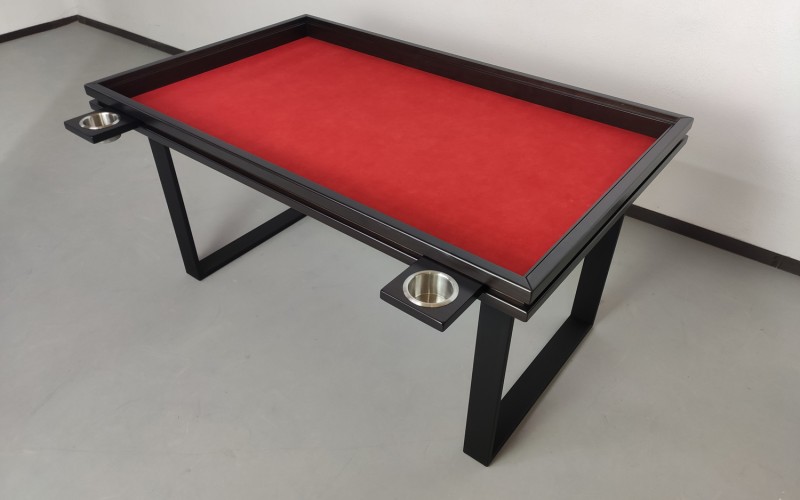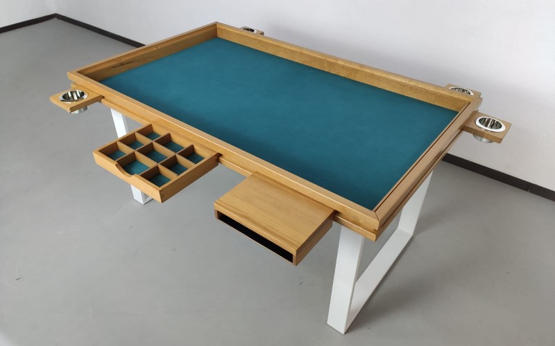 Table hand-crafted with solid oak or pine wood (PEFC ecological certificate).  High strength varnish. Choice of colour. it is not made in special measures. Four wooden leaves cover the gaming vault. Push mechanisms elevates the first leave”. Fixed insert. External nails for accessories. Internal rail systems to hold cards. Wooden beam  to separate games. Compatible with the 32cm extension system. No available with a drawer to store lids or with LED lighting.