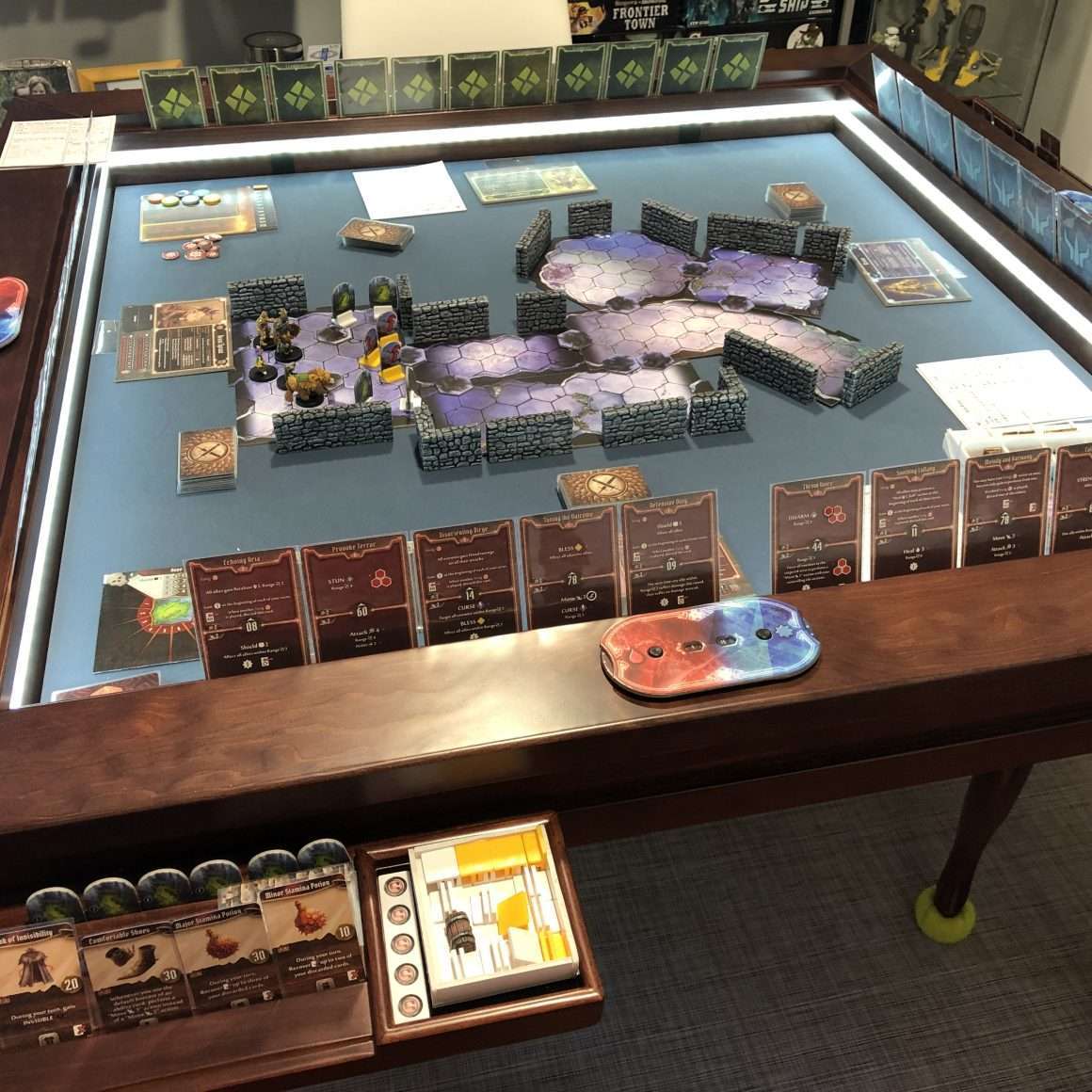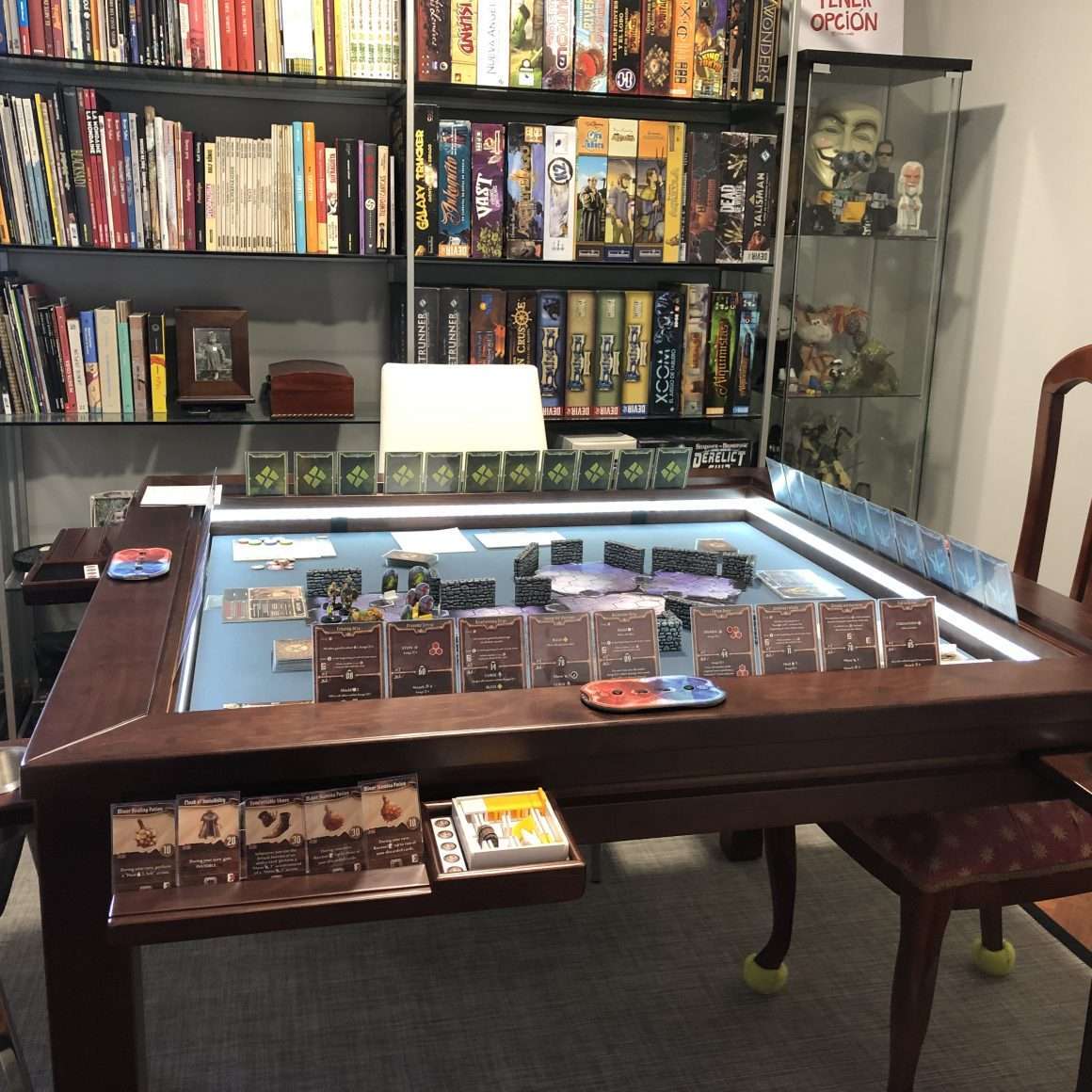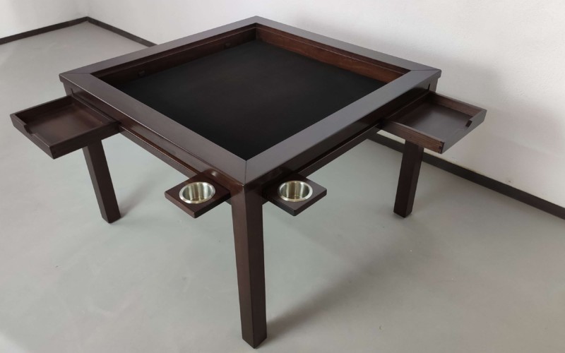 Table hand-crafted with solid oak or pine wood (PEFC ecological certificate). High strength varnish. Choice of colour. Size of the table can be adapted to customer’s needs. Three wooden leaves cover the gaming vault. Push mechanisms elevates the first leave”. Wooden vault floor with the possibility of putting reversible insert. External nails for accessories. Internal rail systems to hold cards. Wooden beam to separate games. Compatible with the 40cm extension system and with LED lighting. No available with a drawer to store lids.
