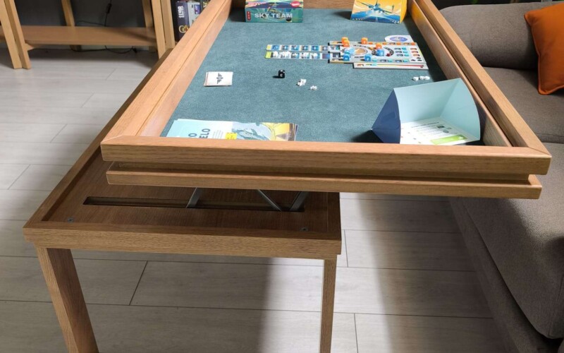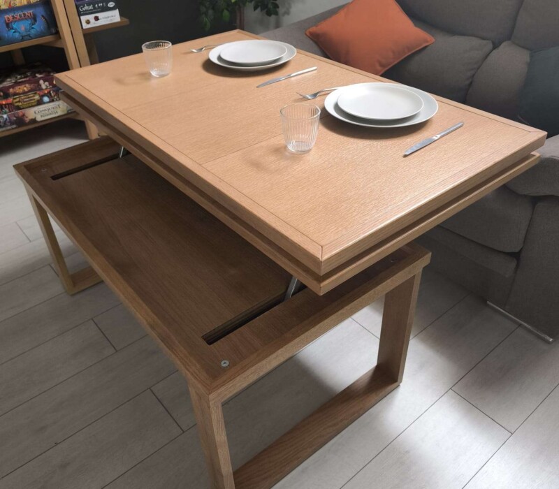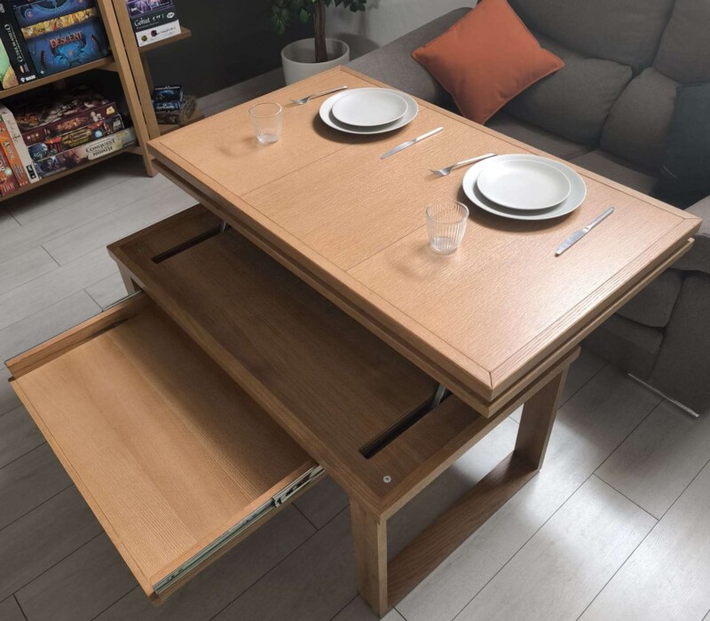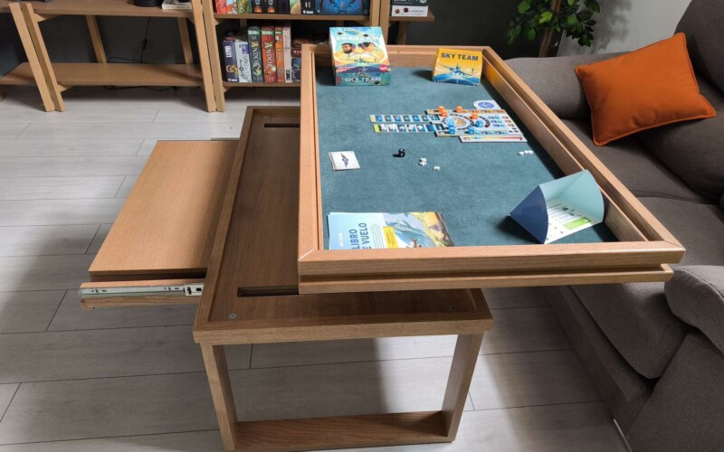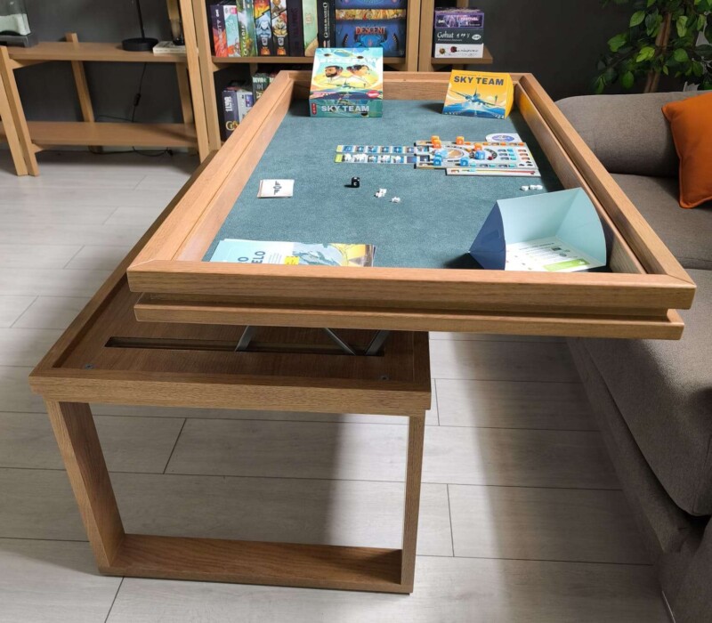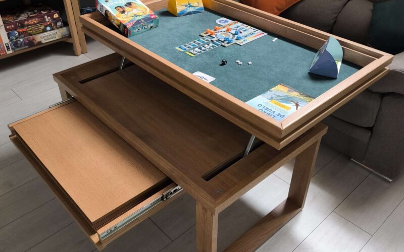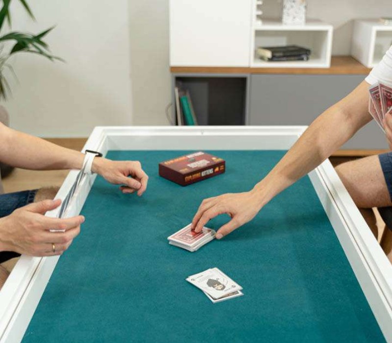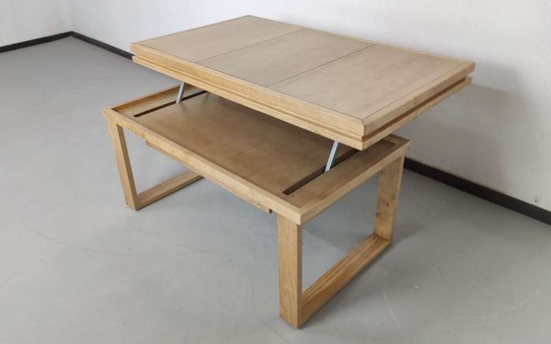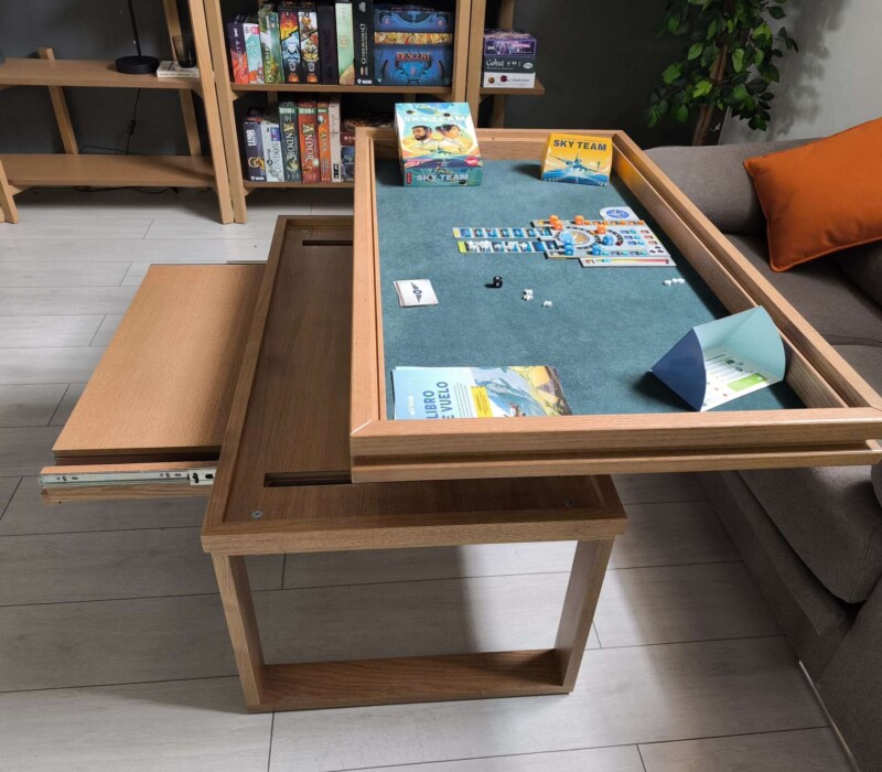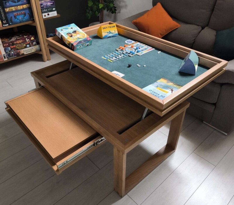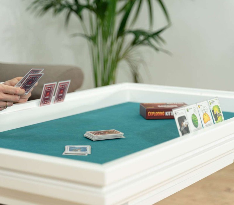 Table hand-crafted with solid oak or pine wood (PEFC ecological certificate). High strength varnish. Choice of colour. It is not made in special measures. Three wooden leaves cover the gaming vault. Push mechanisms elevates the first leave”. Fixed insert . External nails for accessories. Internal rail systems to hold cards. No compatible with LED lighting. Compatible with elevator system and with a drawer to store lids.