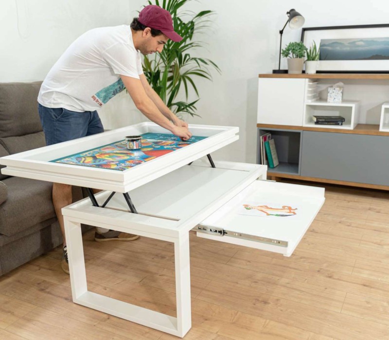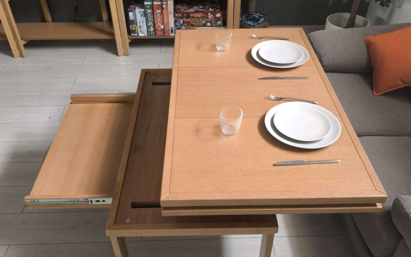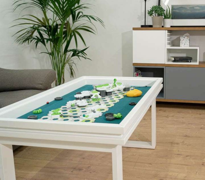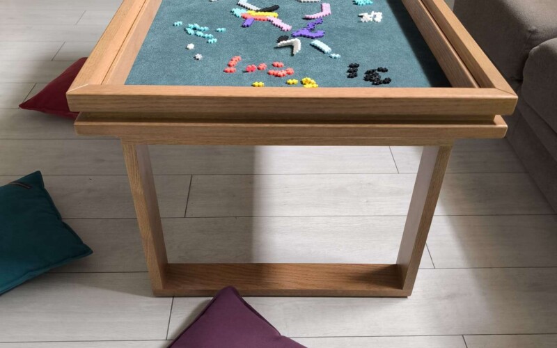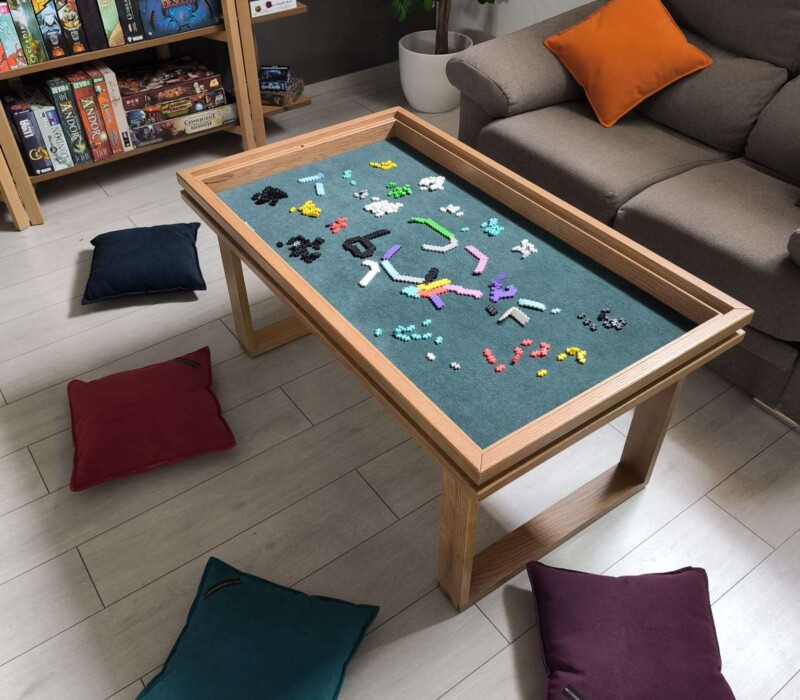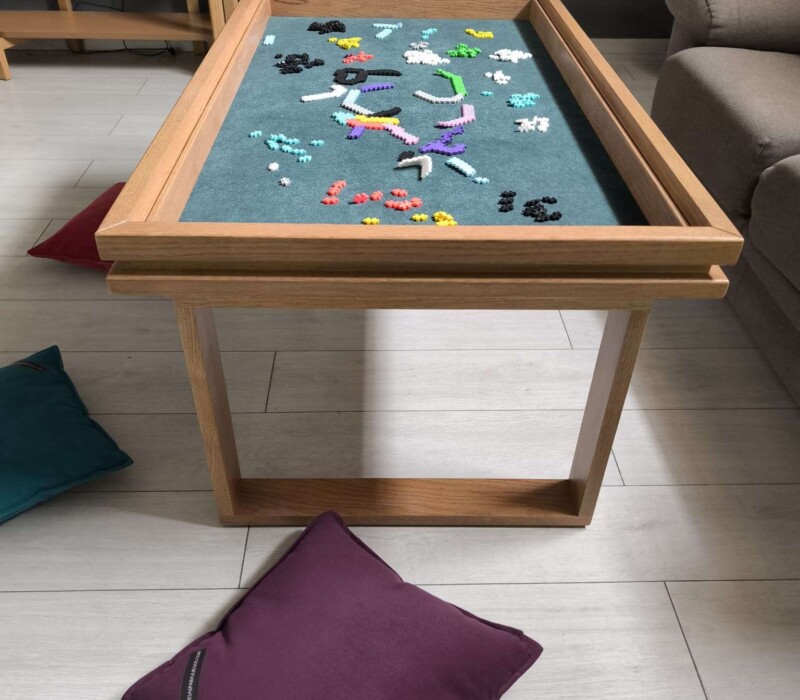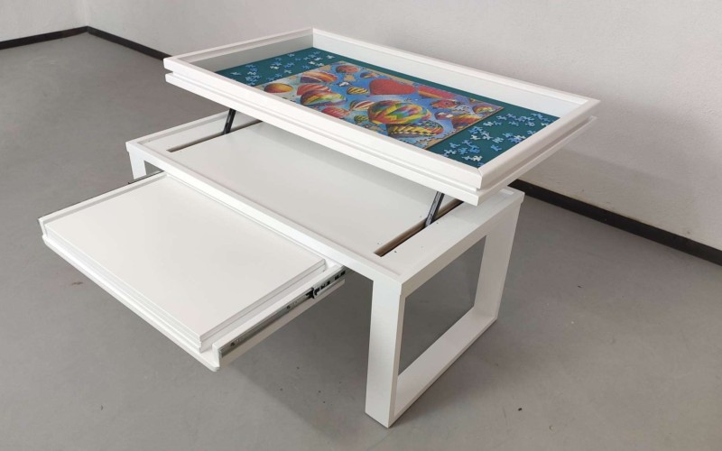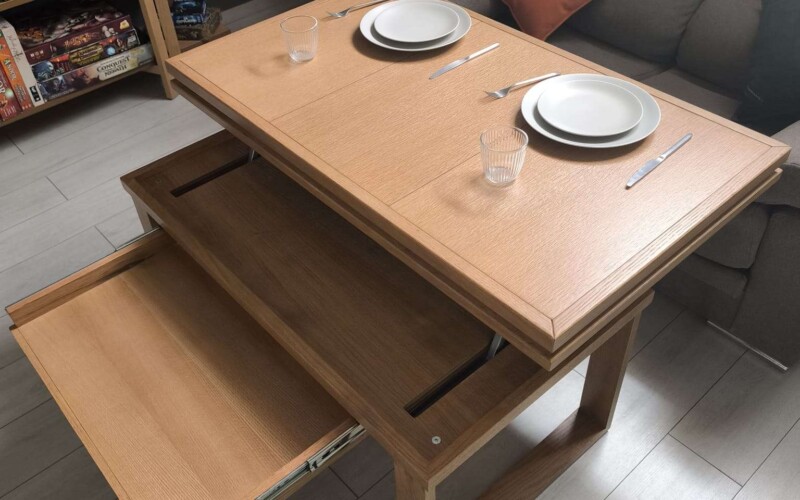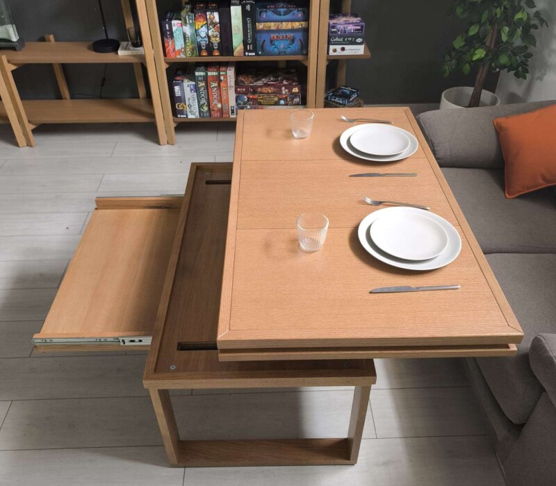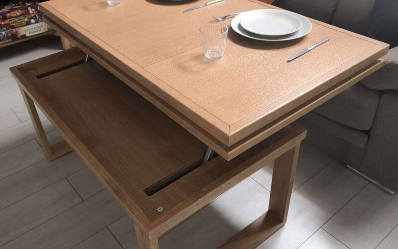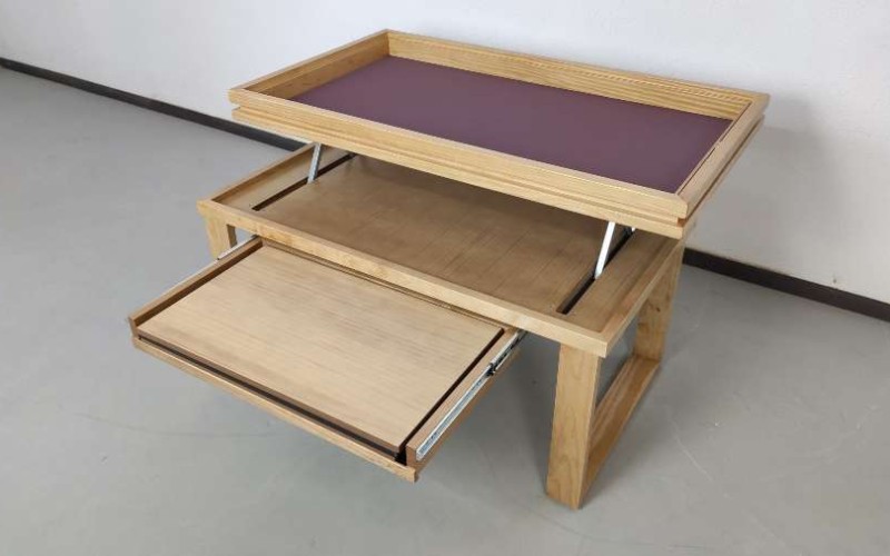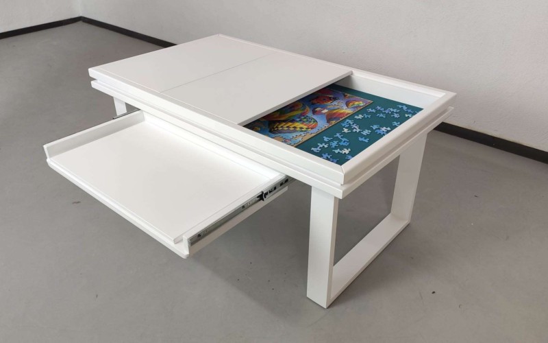 Table hand-crafted with solid oak or pine wood (PEFC ecological certificate). High strength varnish. Choice of colour. It is not made in special measures. Three wooden leaves cover the gaming vault. Push mechanisms elevates the first leave”. Fixed insert . External nails for accessories. Internal rail systems to hold cards. No compatible with LED lighting. Compatible with elevator system and with a drawer to store lids.