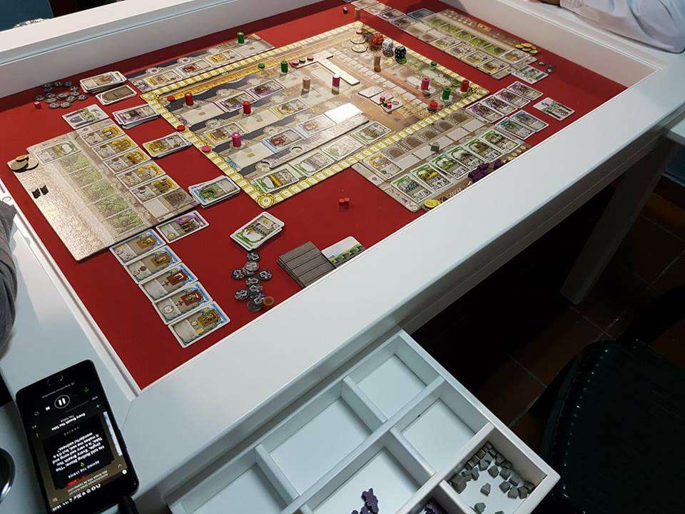 Table hand-crafted with solid oak or pine wood (PEFC ecological certificate).  High strength varnish. Choice of colour. Size of the table can be adapted to customer’s needs. Three wooden leaves cover the gaming vault. Push mechanisms elevates the first leave”. Fixed insert. External nails for accessories. Internal rail systems to hold cards. Wooden beam to separate games. Compatible with the 40cm extension system and with LED lighting. No available with a drawer to store lids.