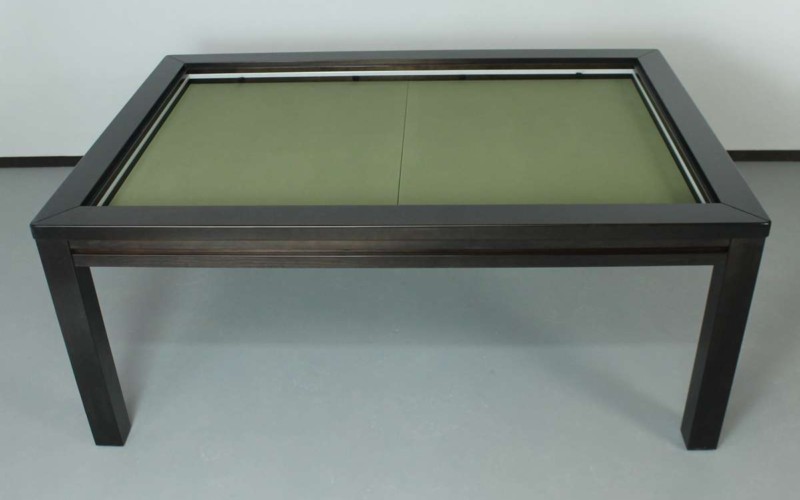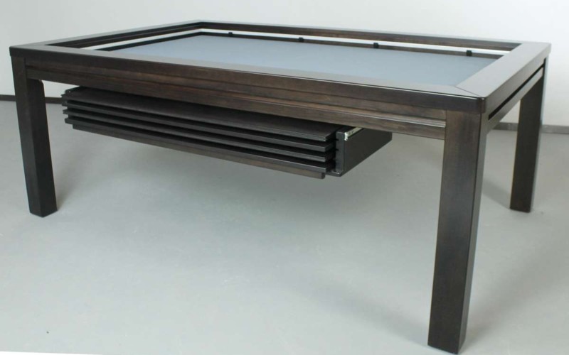 Mesa para juegos Zeus fabricada en pino macizo con certificado ecológico (PEFC). Acabado en barniz de alta dureza. Elección de color. Medidas adaptables a las necesidades del cliente. Tapa de 4 piezas. Elevación de tapas mediante sistema “push”. Fondo acabado en madera con posibilidad de poner fondo tapizado reversible. Carril exterior para sujeción de accesorios. Rail interior para colocación de cartas y listón separador de partidas. Compatible con cajonera para guardar tapas, con la iluminación de leds, con el sistema de extensión de 40cm y con los soportes para guardar la partida bajo la base.