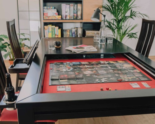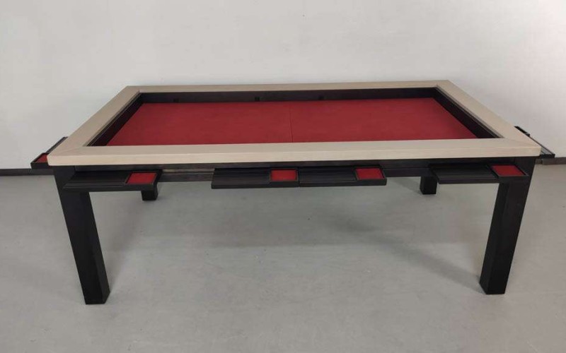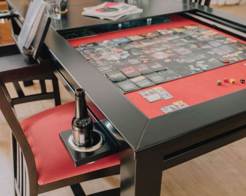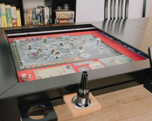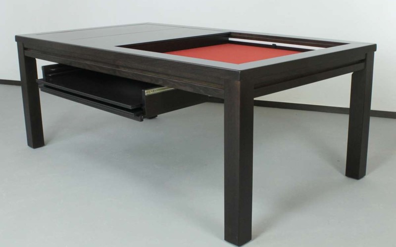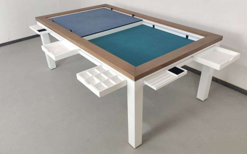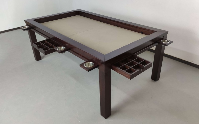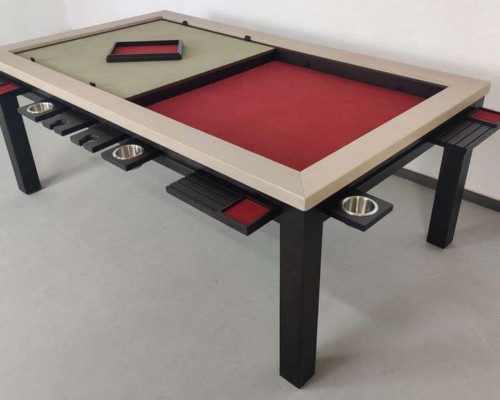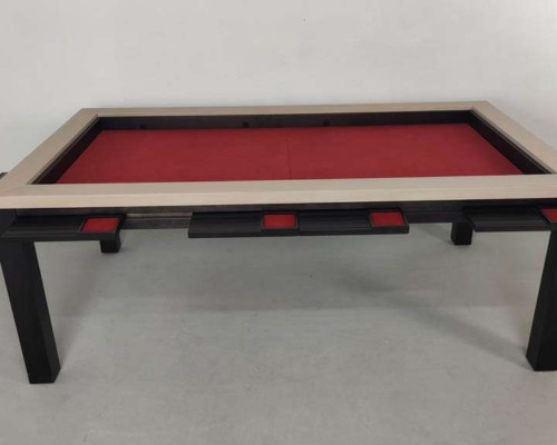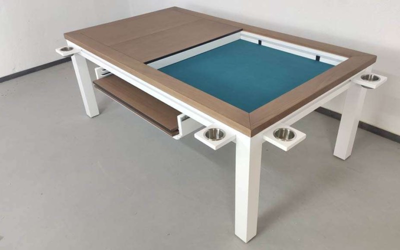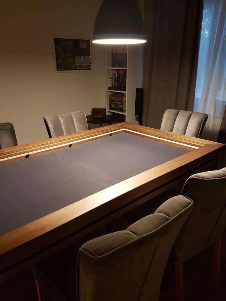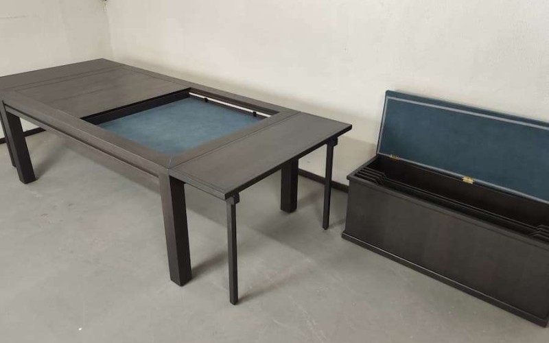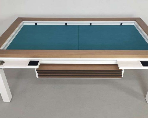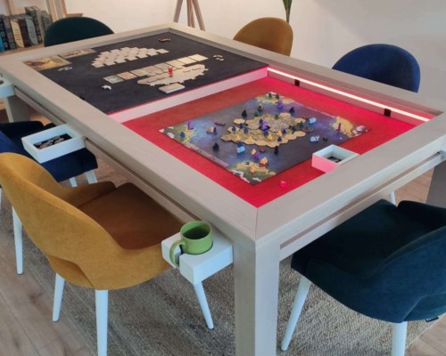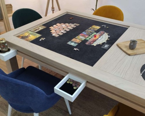 Table hand-crafted with solid oak or pine wood (PEFC ecological certificate). High strength varnish. Choice of colour. Size of the table can be adapted to customer’s needs. Four wooden leaves cover the gaming vault. Push mechanisms elevates the first leave. Wooden vault floor with the possibility of putting reversible insert. External nails for accessories. Internal rail systems to hold cards. Wooden beam to separate games. Compatible with a drawer to store lids, with LED lighting, with the 40cm extension system and with padded wooden blocks to save games under insert.