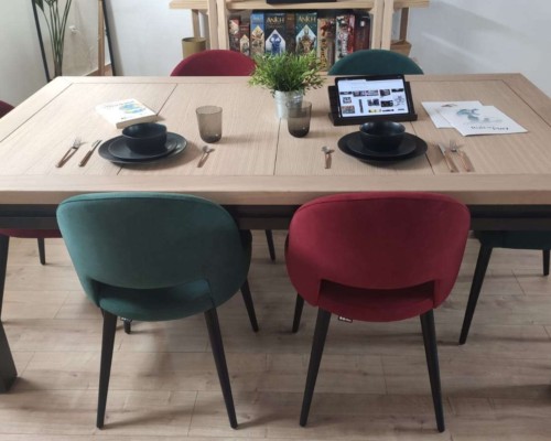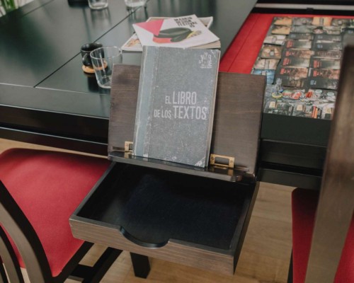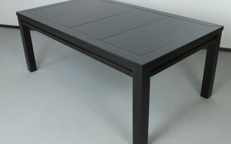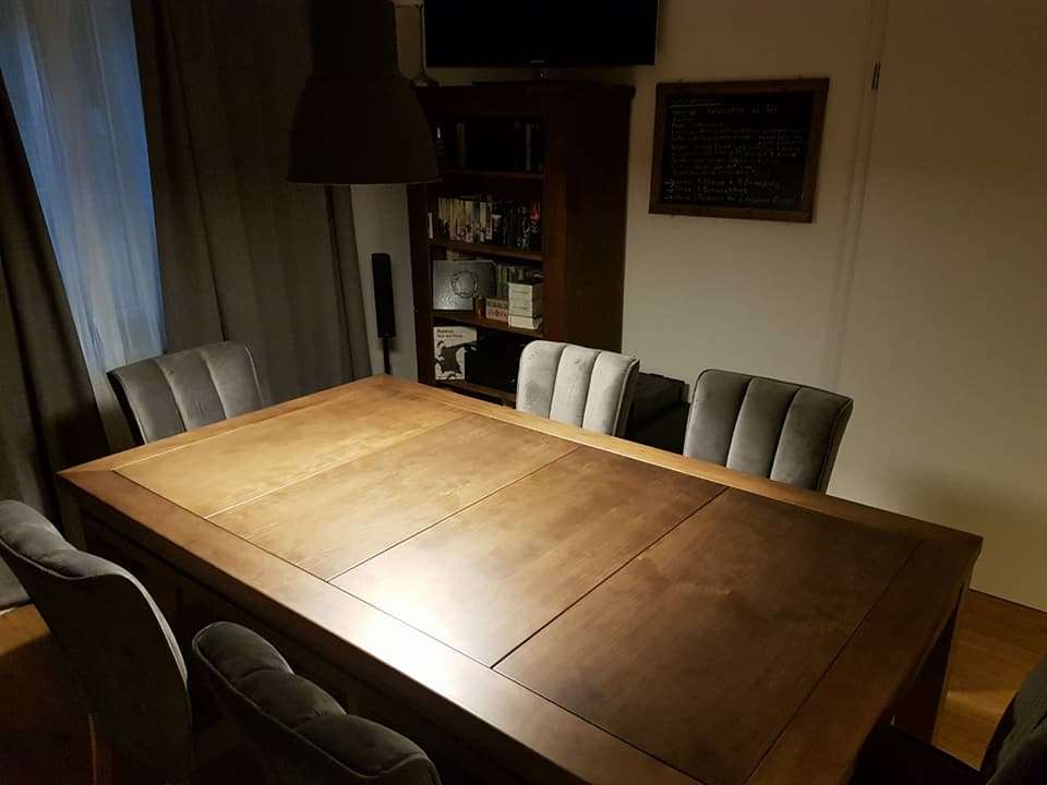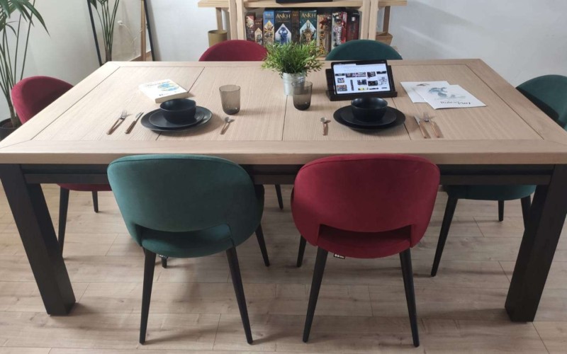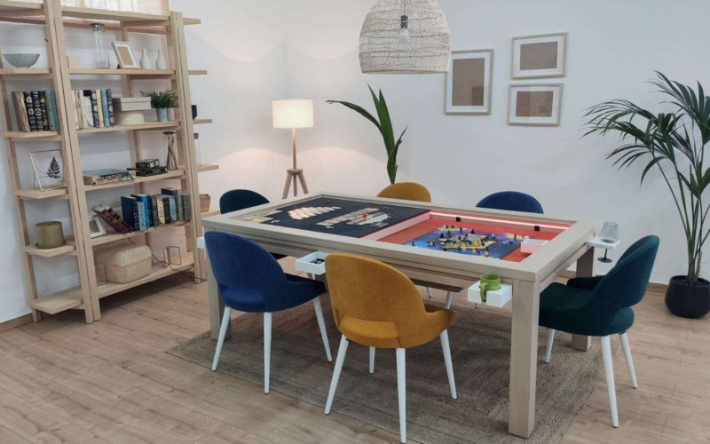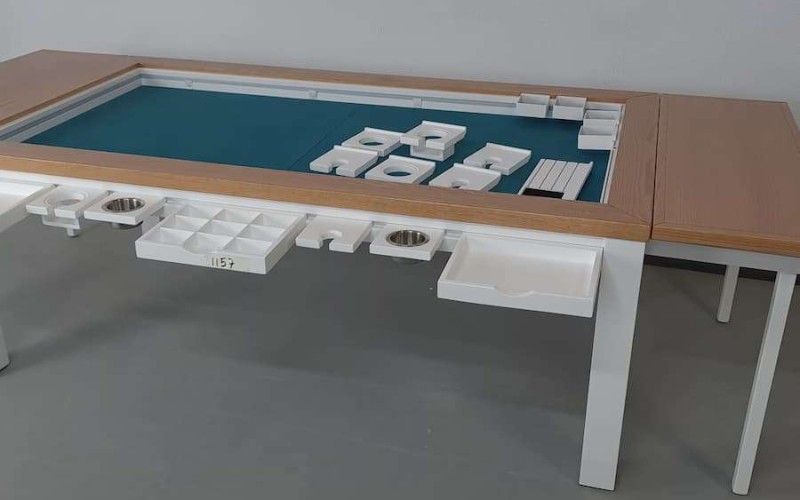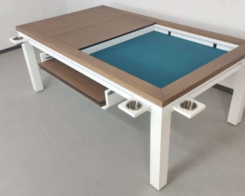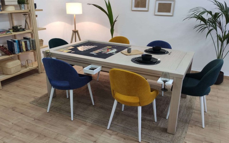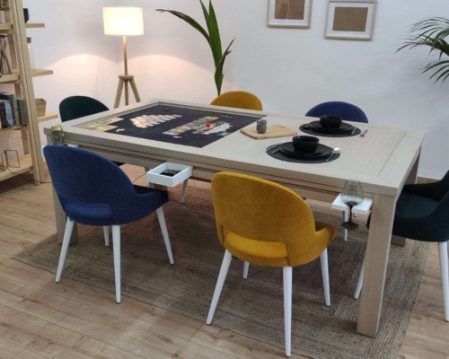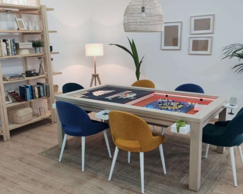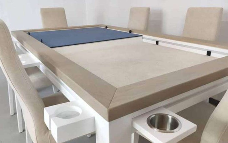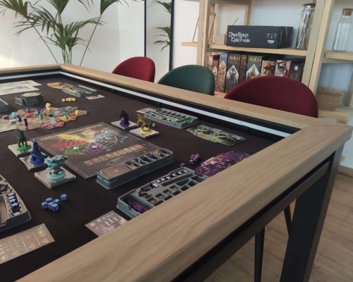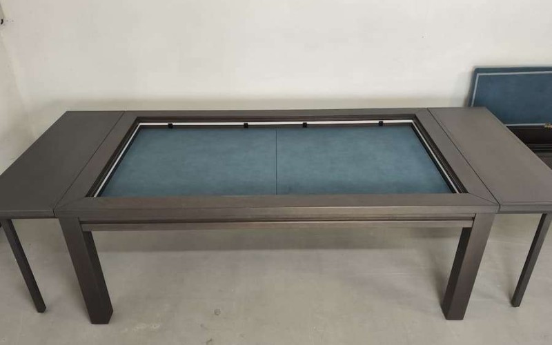 Table hand-crafted with solid oak or pine wood (PEFC ecological certificate). High strength varnish. Choice of colour. Size of the table can be adapted to customer’s needs. Four wooden leaves cover the gaming vault. Push mechanisms elevates the first leave. Wooden vault floor with the possibility of putting reversible insert. External nails for accessories. Internal rail systems to hold cards. Wooden beam to separate games. Compatible with a drawer to store lids, with LED lighting, with the 40cm extension system and with padded wooden blocks to save games under insert.